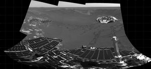 This partial panoramic image from NASA's Mars Exploration Rover Opportunity shows the lander in the center of the crater at…