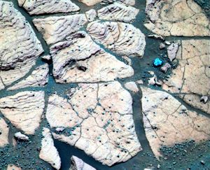 This image, taken at a region of the rock outcrop dubbed 'Shoemaker's Patio' near NASA's Mars Exploration Rover Opportunity's landing…