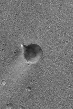 This image from NASA's Mars Global Surveyor shows a volcano and surrounding terrain on Mars that have been thickly mantled…