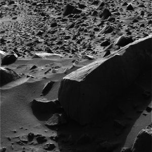 NASA's Mars Exploration Rover Opportunity shows the large, imposing shadowed rock in the foreground nicknamed 'Sandia' for a mountain range…