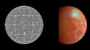 NASA's Galileo spacecraft acquired this global mosaic (right) during Galileo's third orbit on Nov. 4, 1996. The lighter bluish area…