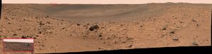 NASA's Mars Exploration Rover Spirit acquired this panoramic camera image on the March 12, 2004. The reflective speck about 200…