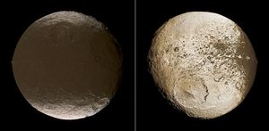 These two global images of Iapetus taken by NASA's Cassini's spacecraft show the extreme brightness dichotomy on the surface of…