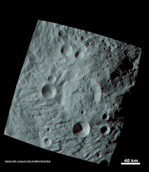 This 3D image of asteroid Vesta from NASA's Dawn spacecraft shows hills, troughs, ridges and steep craters. You need 3D…