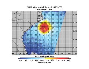 This image from NASA's SMAP shows wind estimates over Hurricane Florence on Sept. 13, 2018. The hurricane has weakened from…