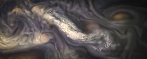 Clouds in a Jovian jet stream, called Jet N5, swirl in the center of this color-enhanced image from NASA's Juno…