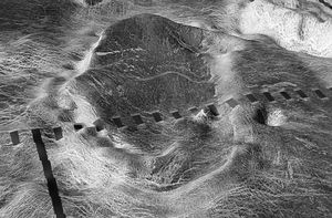 This view from NASA's Magellan spacecraft is a close-up of Atete Corona, a 600-km-long and 450-km-wide feature at latitude 16…