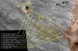 This map shows the path NASA's Mars Exploration Rover Spirit will traveled toward its future target, the large crater dubbed…