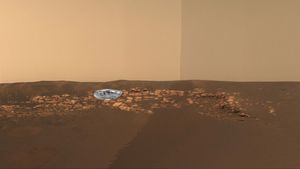 NASA's Mars Exploration Rover Opportunity shows the outcrop that sits just inside the small crater where the rover landed. The…