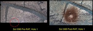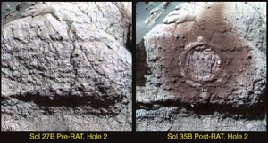 NASA's Mars Exploration Rover Opportunity shows the results of the second drilling by the rock abrasion tool. The drilling took…