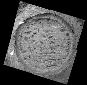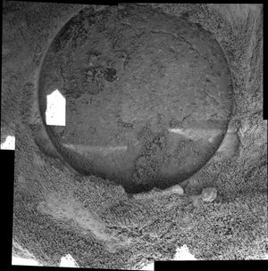 This image taken by the microscopic imager on NASA's Mars Exploration Rover Opportunity shows the hole drilled by the rover's…