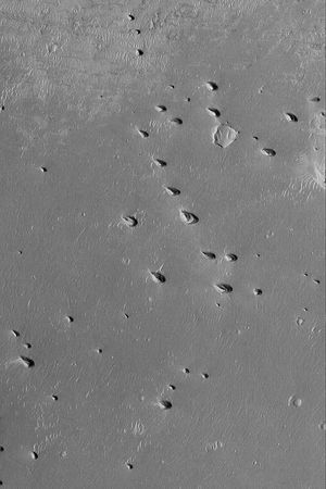 The rims of two old and degraded impact craters are intersected by a graben near Mangala Fossa. This image was…