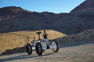 The DuAxel rover is seen here participating in field tests in the Mojave Desert. The four-wheeled rover is composed of…
