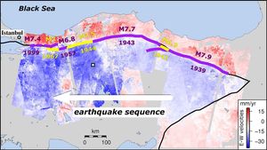 This image shows strain rates on the North Anatolian Fault in Turkey along the east-to-west sequence of earthquakes since 1939.…