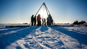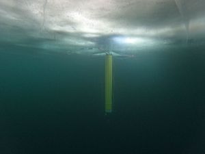 A remote camera captured an IceNode prototype deployed below the frozen surface of Lake Superior, off Michigan's Upper Peninsula, during…
