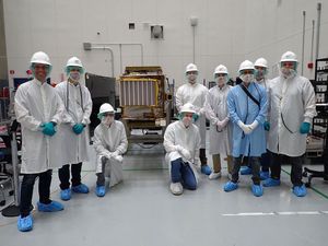 Members of NASA's Lunar Trailblazer team pose with the spacecraft at SpaceX's Payload Processing Facility at NASA's Kennedy Space Center…