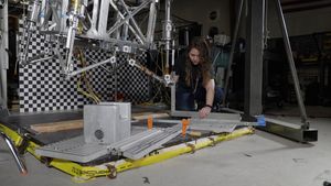 Morgan Montalvo, another JPL engineer, sets guardrails on the floor below the prototype in a test of a scenario where…