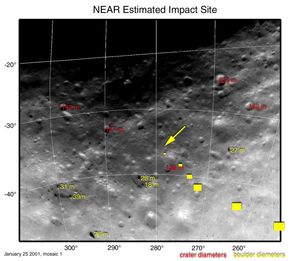 This mosaic made from images taken Jan. 25, 2001 by NASA's NEAR Shoemaker shows diameters of craters in red, and…