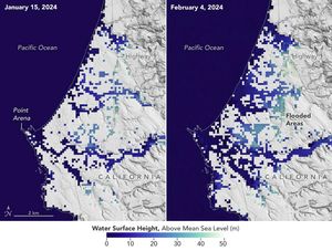 This image shows SWOT satellite data for water surface height in part of Mendocino County, Northern California, on Jan. 15,…