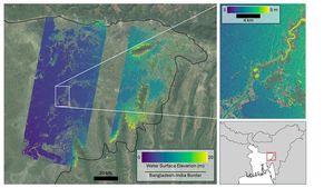 Flooding from monsoon rains covers a wide region of northeast Bangladesh in this Oct. 8, 2023, image showing data from…