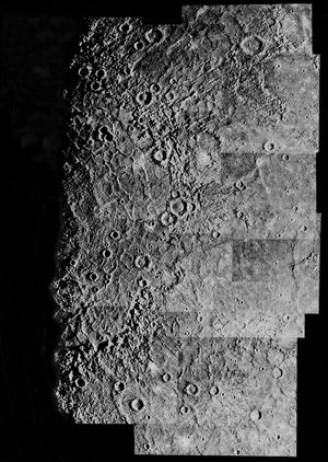This computer generated photomosaic from NASA's Mariner 10 is of the southern half of Mercury's Shakespeare Quadrangle, named for the…