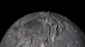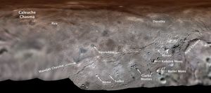This annotated map projection from NASA's New Horizons spacecraft shows Charon, the largest of Pluto's five moons, annotated with its…