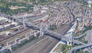 This image shows a satellite view of the Morandi Bridge in Genoa, Italy, prior to its August 2018 collapse.