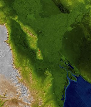 This color-coded shaded relief view from NASA's Shuttle Radar Topography Mission of coastal Chile indicates the epicenter (red marker) of…