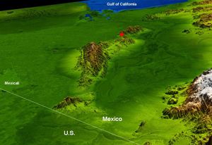 The topography surrounding the Laguna Salada Fault in the Mexican state of Baja, California, is shown in this perspective view…