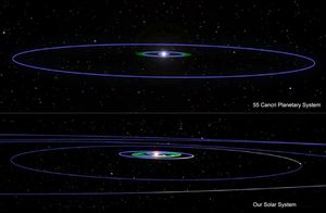 This artist's concept illustrates two planetary systems -- 55 Cancri (top) and our own. Blue lines show the orbits of…