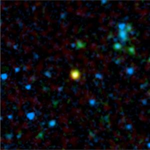 This false-color image from NASA's Spitzer Space Telescope shows a distant galaxy (yellow) that houses a quasar, a super-massive black…