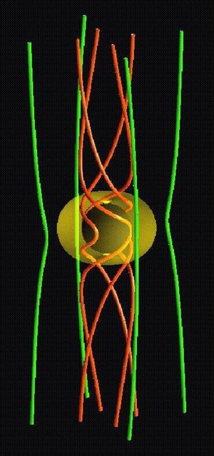 This three-dimensional illustration shows how the rotating space around a black hole twists up the magnetic field in the plasma…
