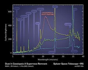 The Cassiopeia A supernova's first flash of radiation makes six clumps of dust (circled in annotated version) unusually hot. The…