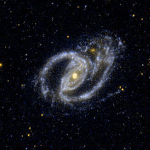 This ultraviolet image from NASA's Galaxy Evolution Explorer shows the interacting pair NGC 1097, a barred spiral galaxy, and the…