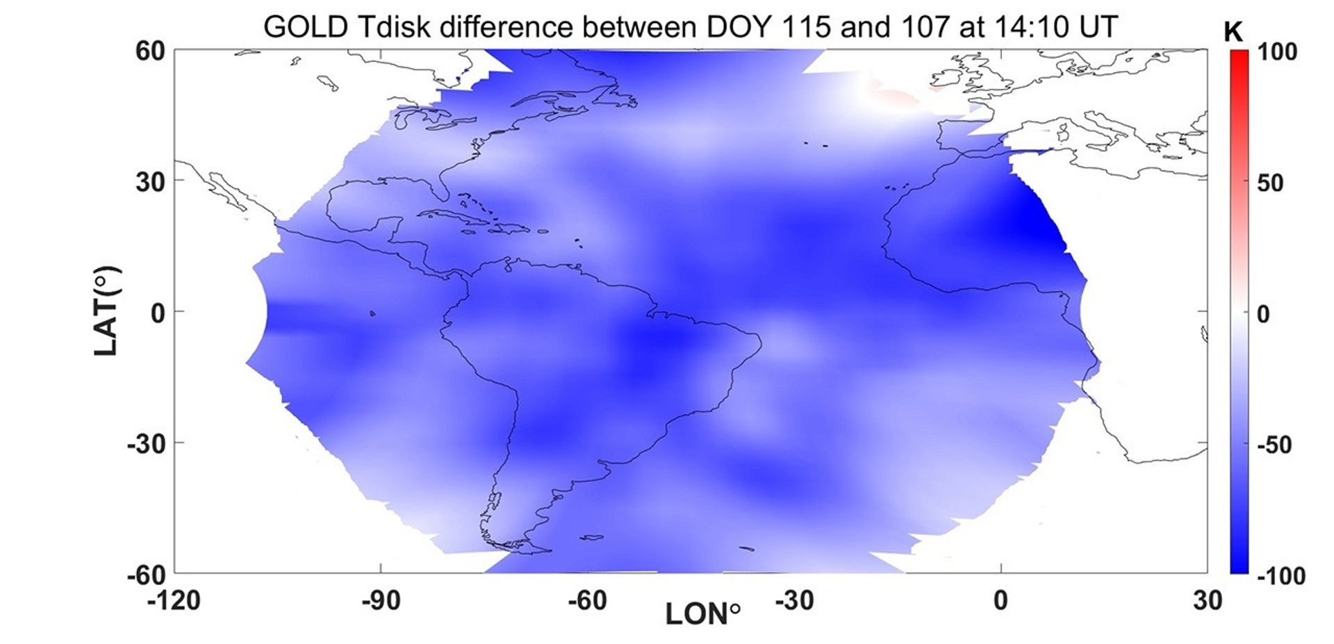 Before, during, and after the storm, GOLD studied the temperature in the middle thermosphere, a part of Earth’s upper atmosphere about 85 to 120 miles overhead. During the storm, temperatures increased throughout GOLD’s wide field of view over the Americas. But surprisingly, after the storm, temperatures dropped about 90 to 198 degrees Fahrenheit lower than they were before the storm (from about 980 to 1,070 degrees Fahrenheit before the storm to 870 to 980 degrees Fahrenheit afterward).