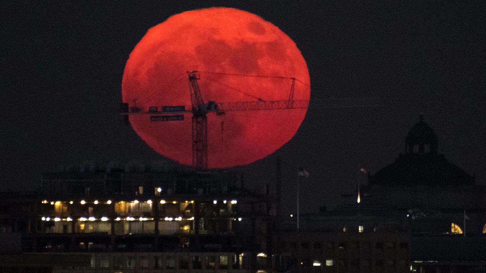 Go out on the night of the full moon and find a good spot to watch it rise. It can be breathtaking, eliciting an awestruck "Wow!" from any skywatcher. When we observe the Moon near the horizon, it often looks HUGE – whether it's peeking over the shoulder of a distant mountain, rising out of the sea, hovering behind a cityscape, or looming over a thicket of trees.