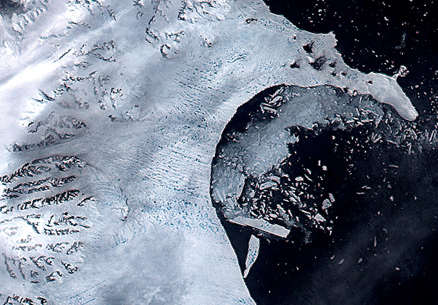 sizes, tabular icebergs (large flat-topped ice masses) calve off Antarctic ice